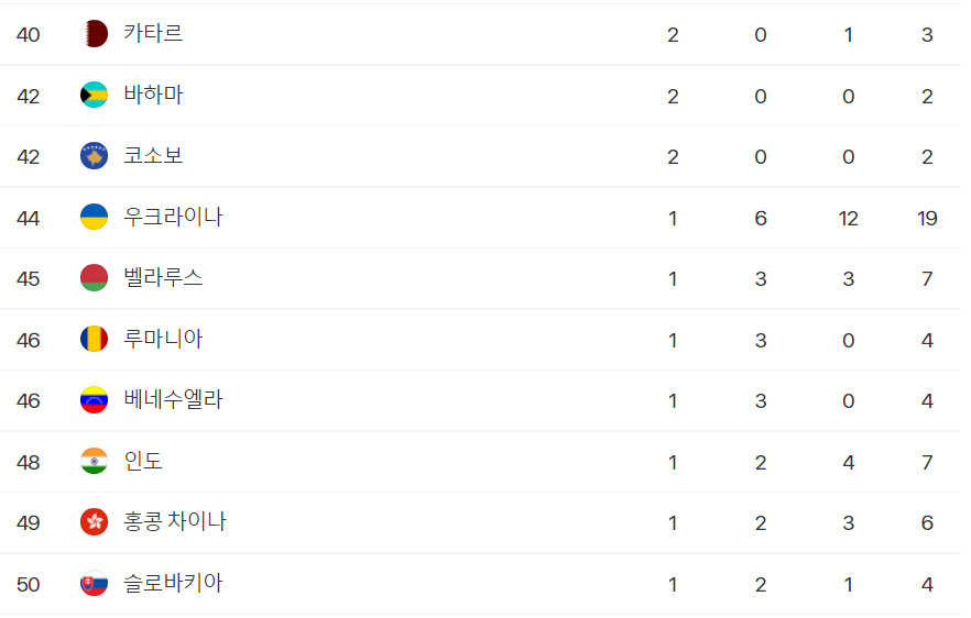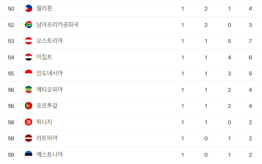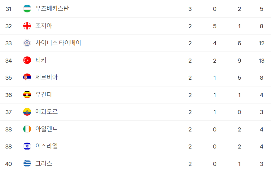 다음은 동메달 1개라도 획득한 국가의 순위 입니다.