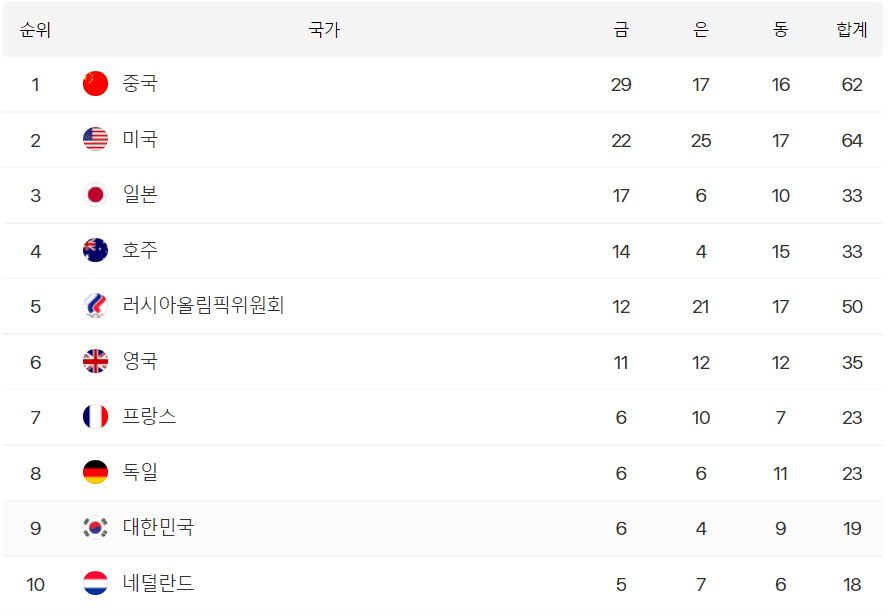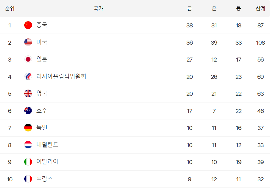 1위 중국 2위 미국 3위 일본 순위는 변동이 없고 영국이 호주를 제치고 4위로 올라섰고