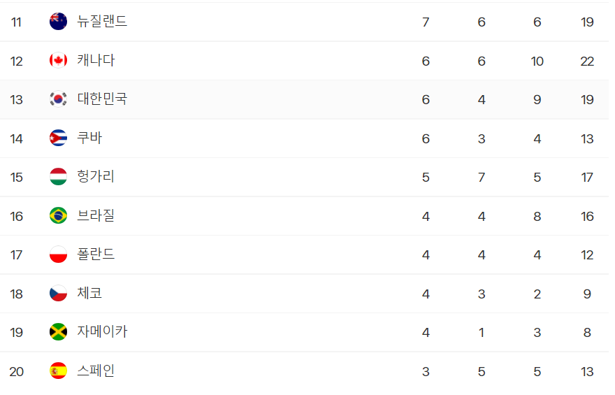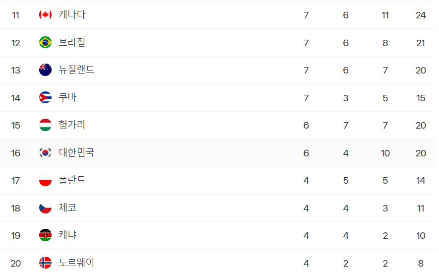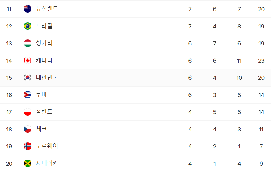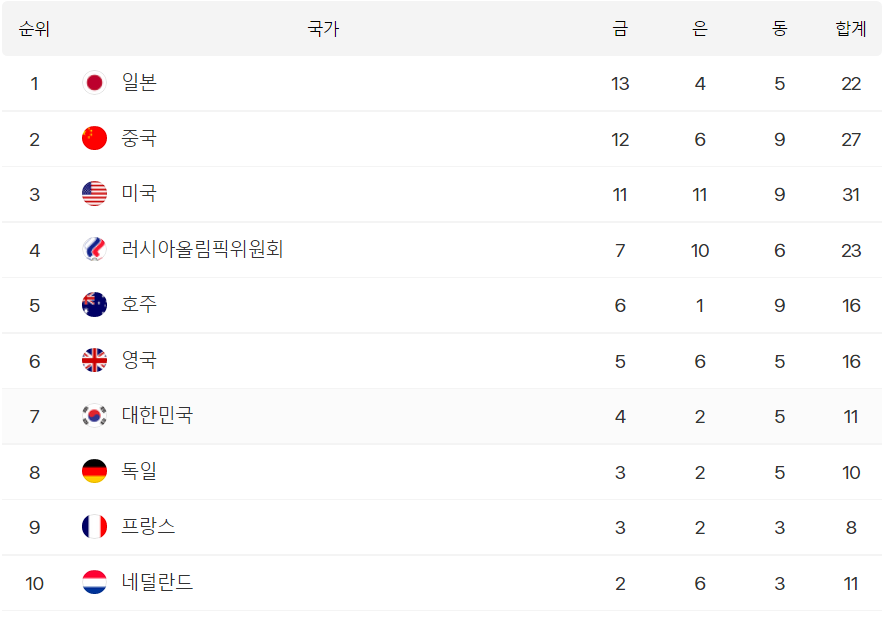 💥7월29일 도쿄올림픽 메달 순위 (7월29일 마감 기준)