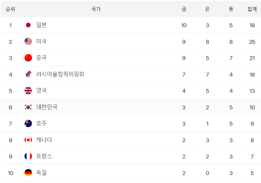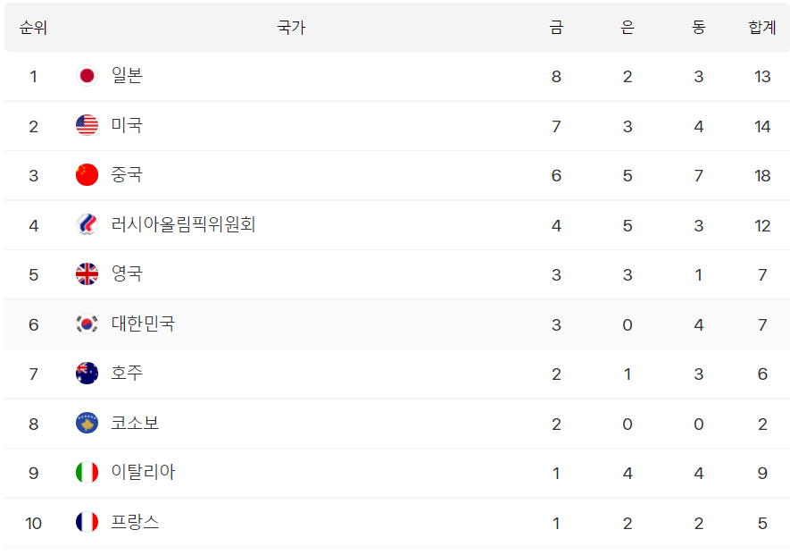 10위권내 큰 순위변동은 없고 대한민국이 도쿄올림픽 시작 이후 첫 노메달에 그치며 10위로