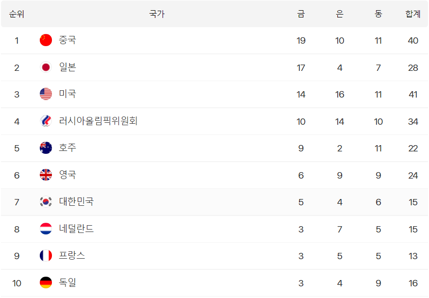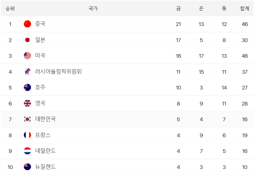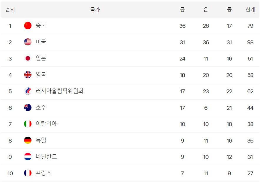 2위는 미국 금메달 22개 3위 일본 금메달 17개... 일본은 이제 상승동력이 다 떨어진듯...