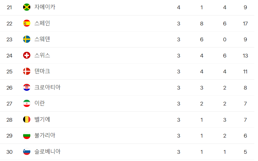 💥7월30일 도쿄올림픽 메달 순위(30일 마감 기준)