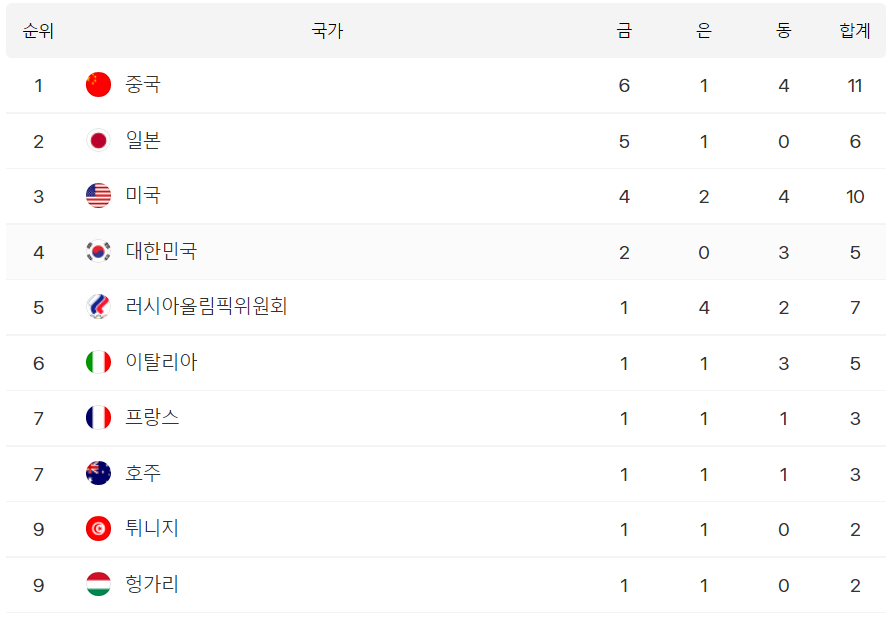 1위 중국 금3 동1, 2위 일본 금1 은1, 2위 이탈리아 금1 은1, 대한민국 금1 동2개로 4위를 기록중