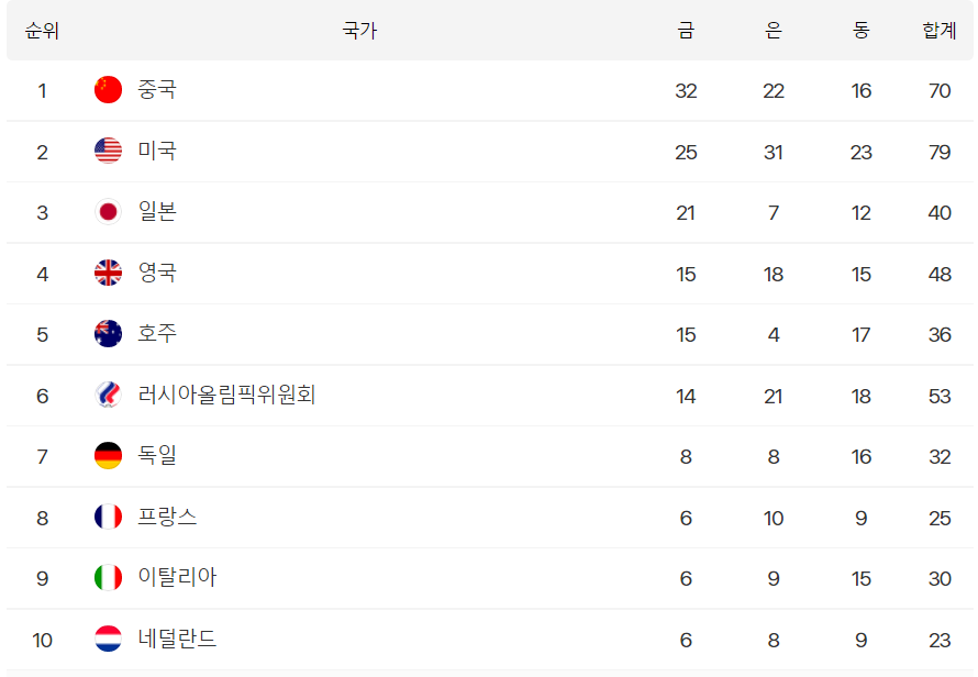 8월4일 마감기준 도쿄올림픽 메달순위인데 중국 미국 일본 순서로 3위까지는 변동이 없고