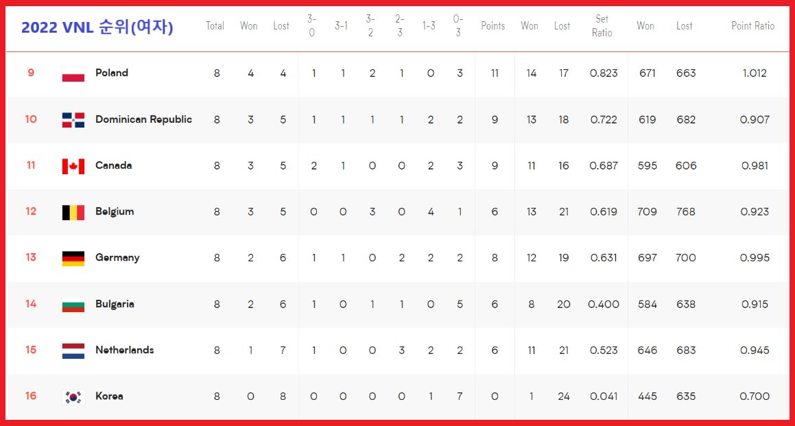 하위권인 9위부터 16위까지 순위는 폴란드가 4승4패로 9위, 도미니카가 3승5패로 10위를 기록중이고
