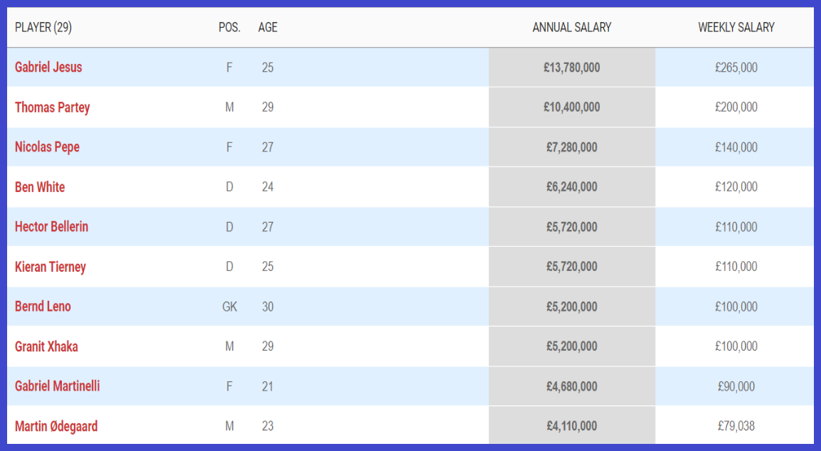 아스날은 이번시즌 선수들에 £102,584,000(한화 1620억원)의 연봉을 지급해 EPL에서 연봉총액순위